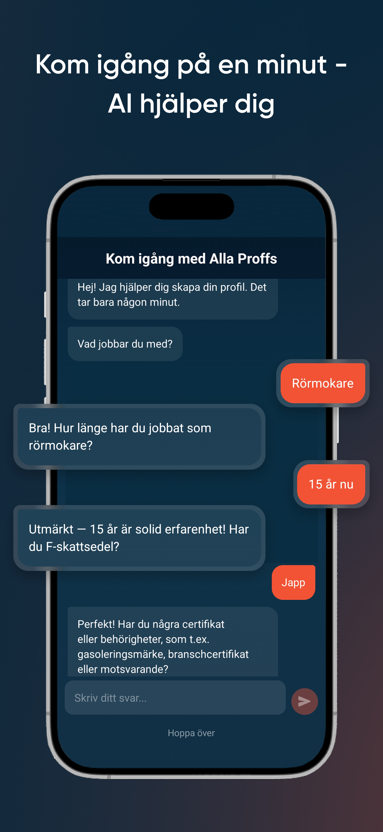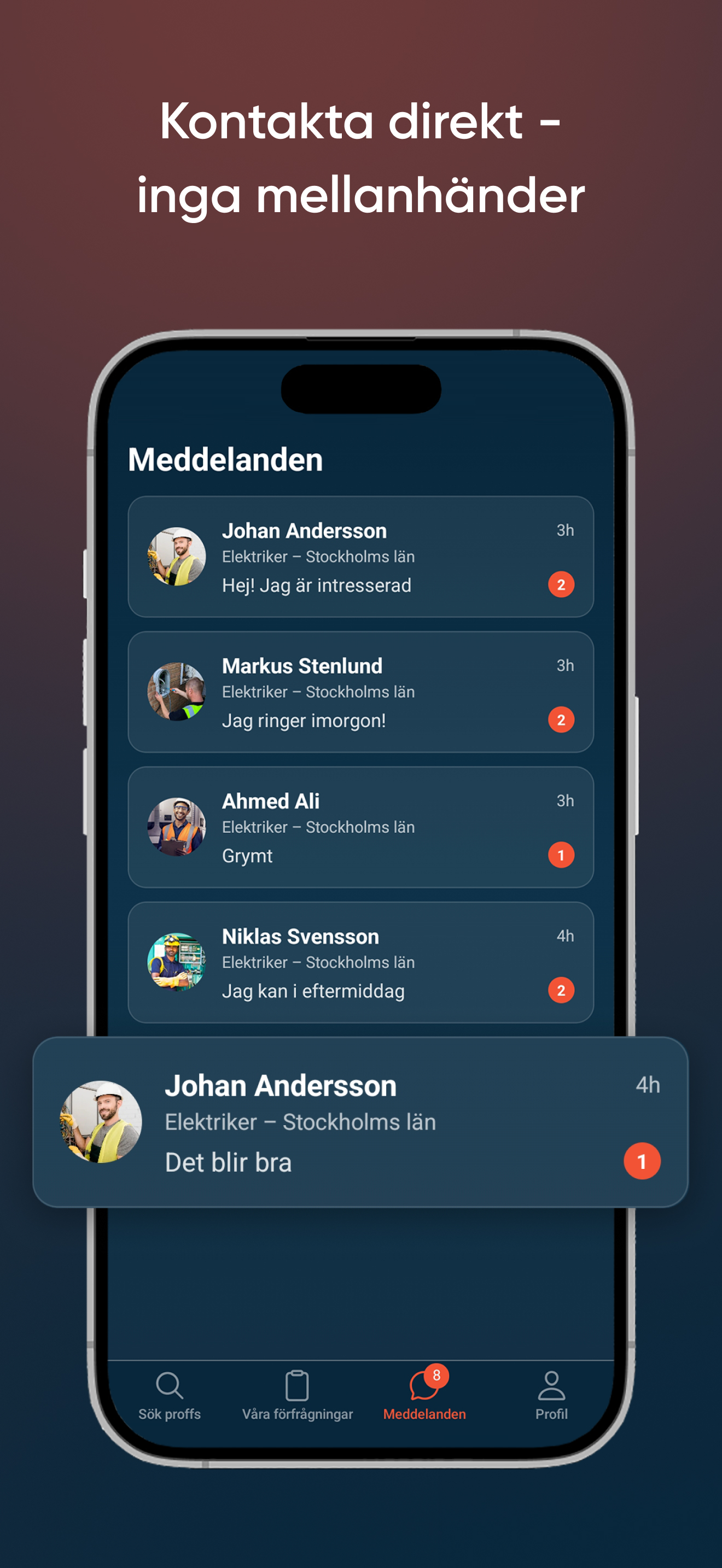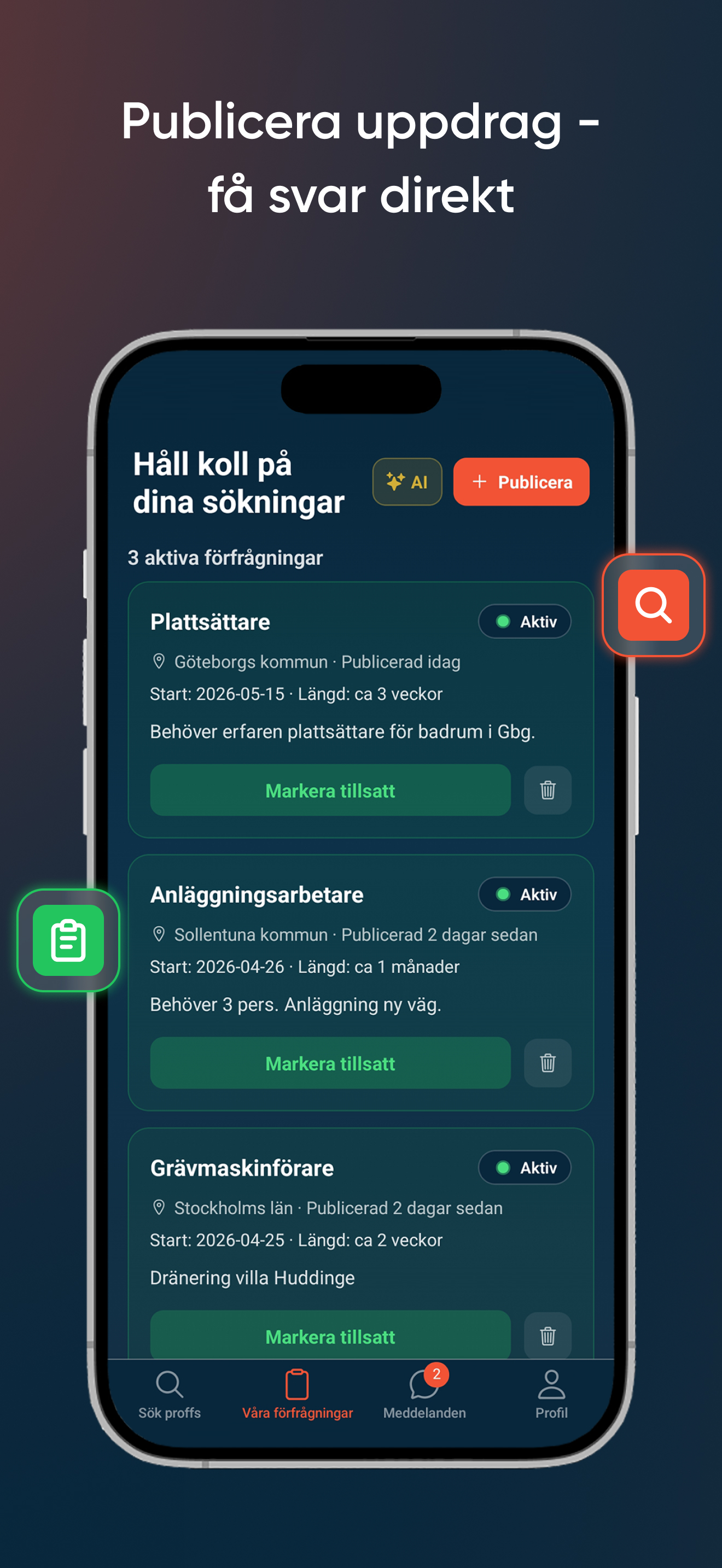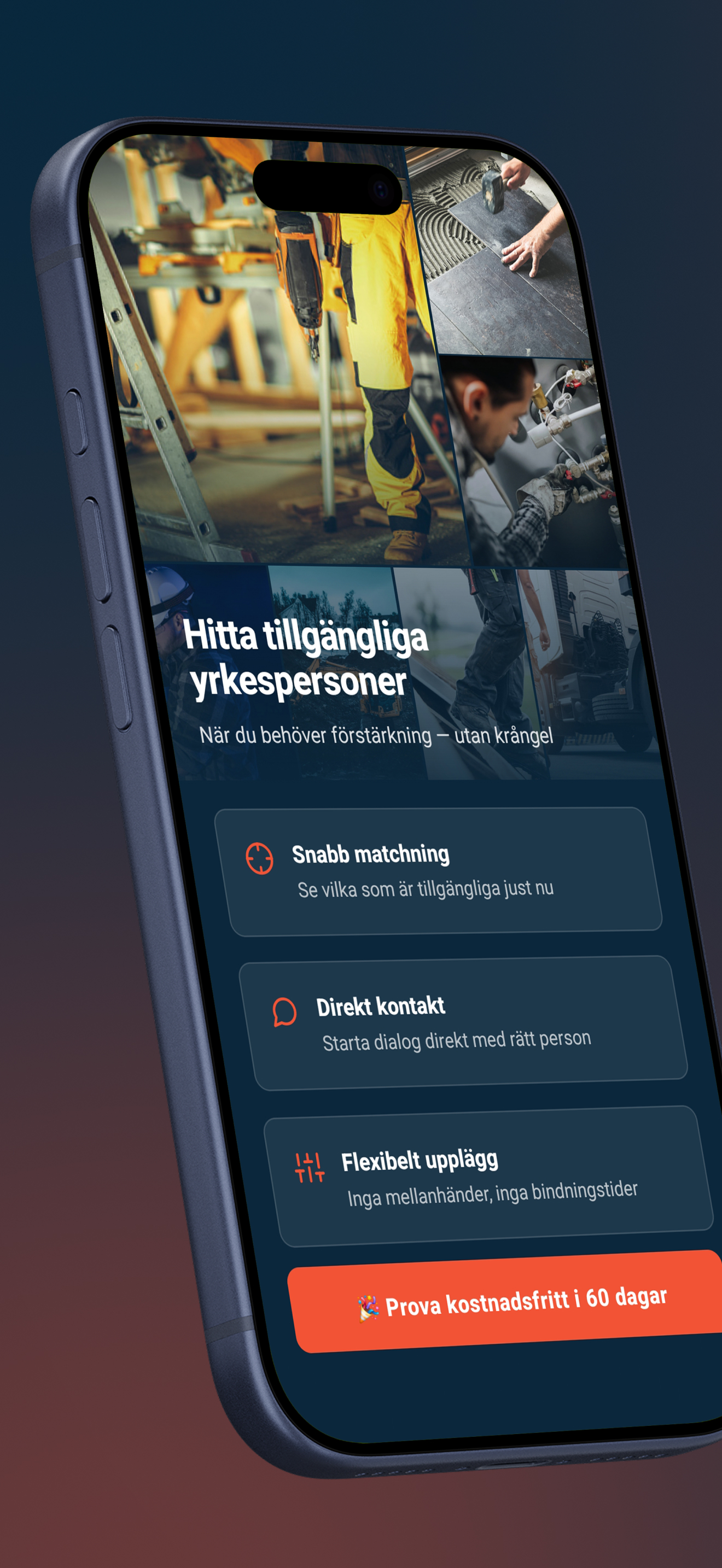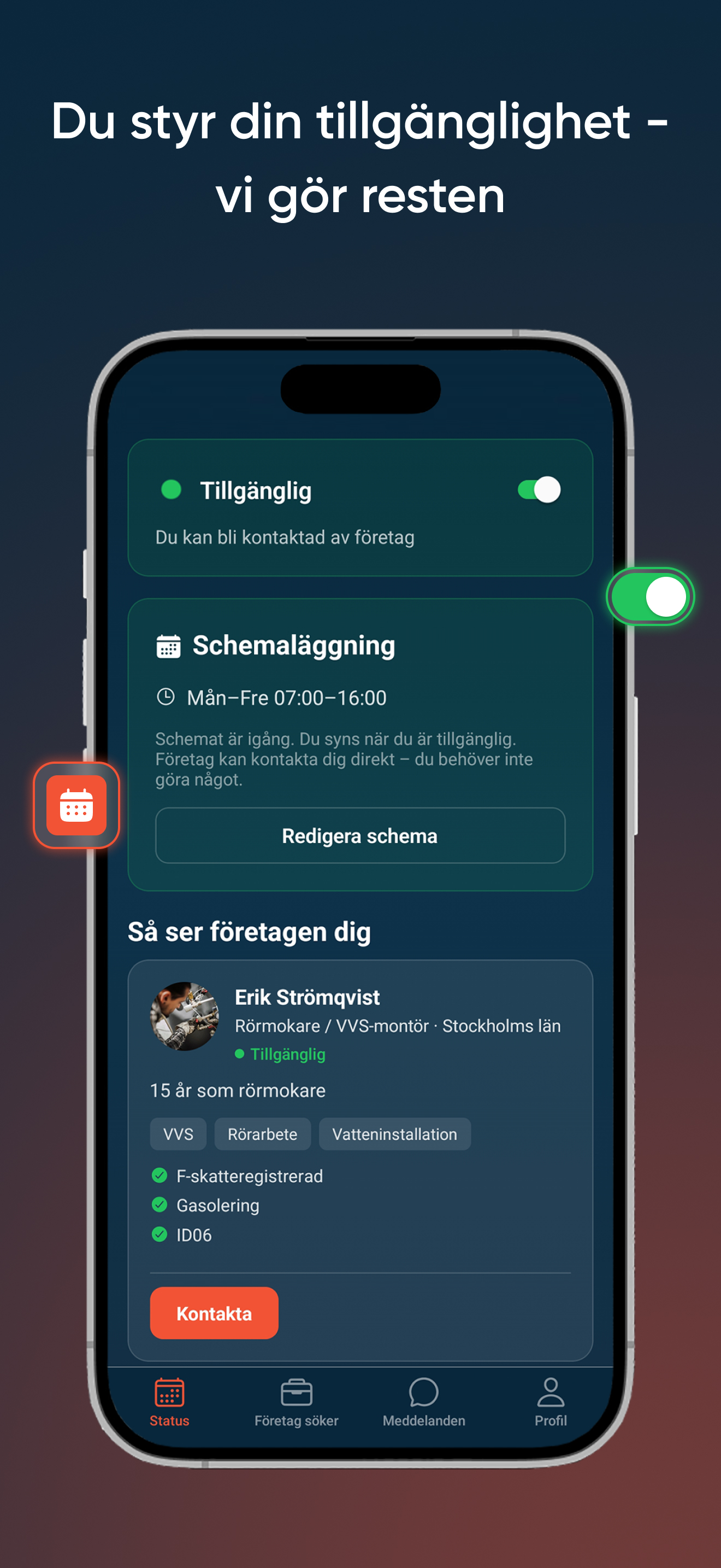 Visa din tillgänglighet när det passar dig. Bli hittad av företag som söker din kompetens — och svara på uppdrag från privatpersoner som behöver en hantverkare.