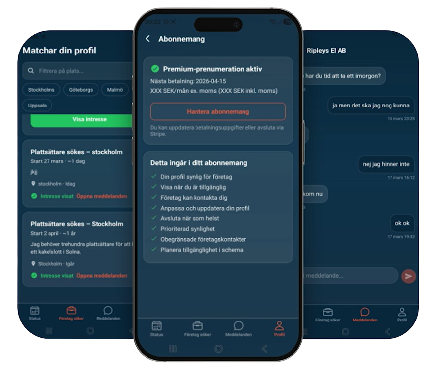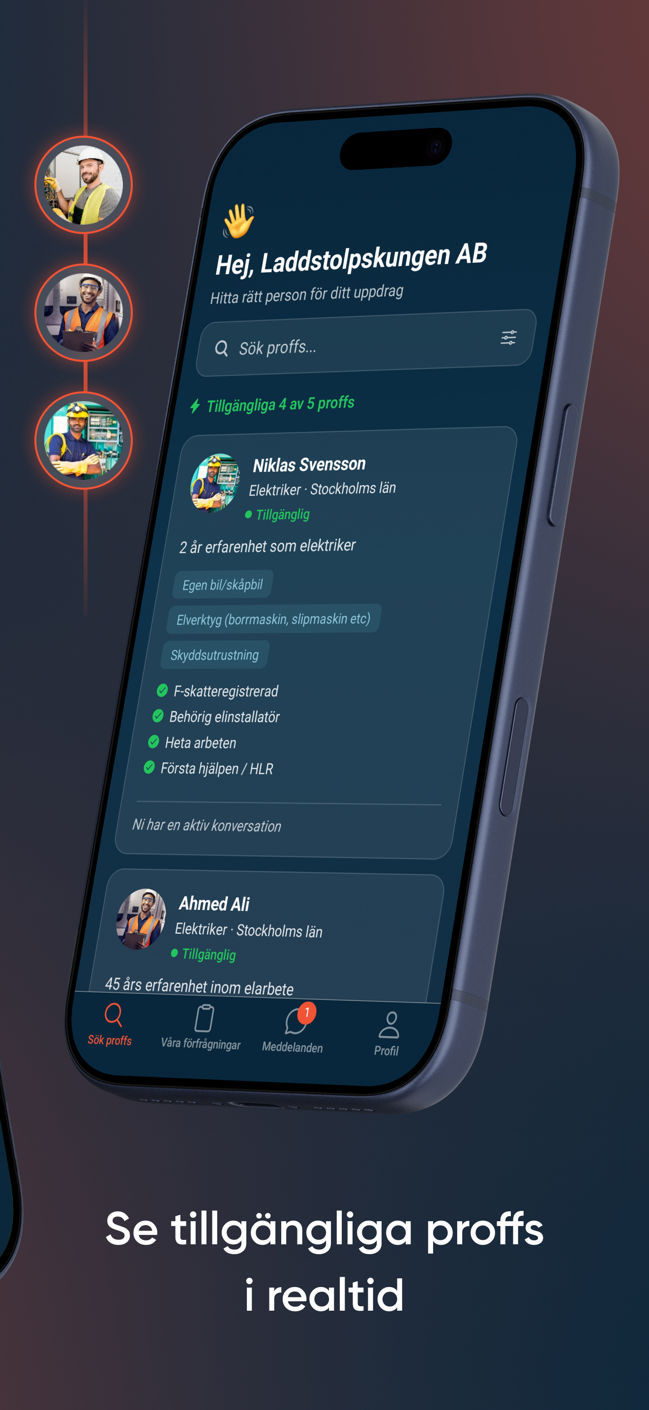 Visa din tillgänglighet när det passar dig. Bli hittad av företag som söker din kompetens — och svara på uppdrag från privatpersoner som behöver en hantverkare.